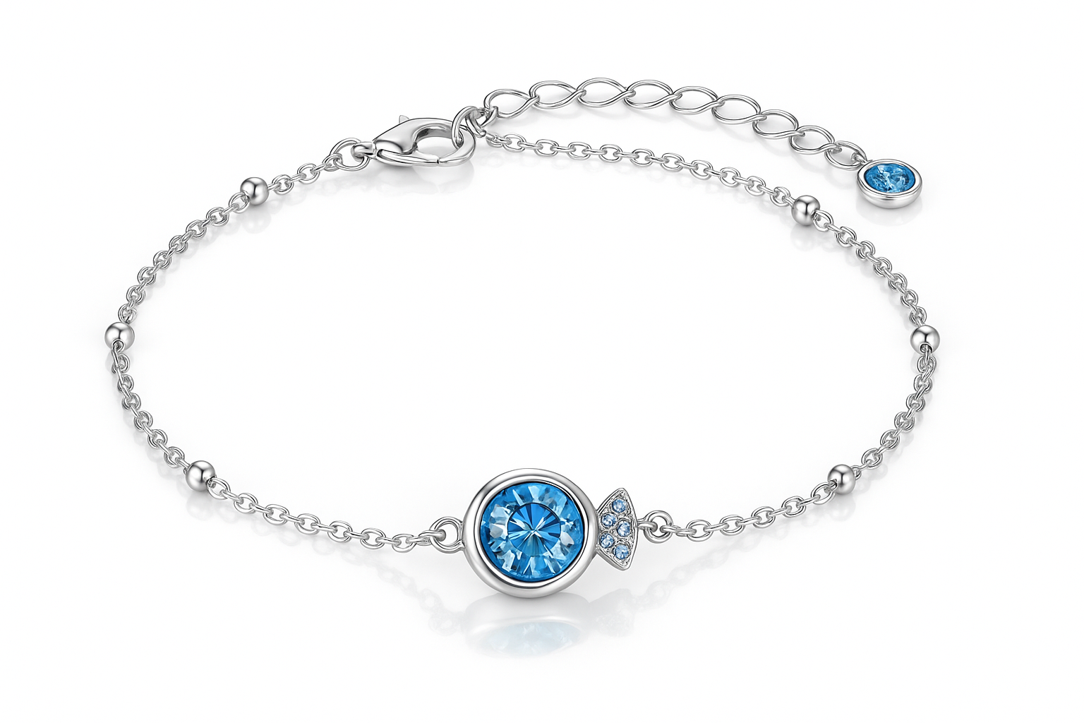 Dieses zarte Armband vereint funkelnde Zirkonia-Steine mit einem zeitlos eleganten Design. Im Mittelpunkt steht ein brillant geschliffener, himmelblauer Zirkonia, der von einem verspielten Candy-Motiv eingerahmt wird. Kleine, kunstvoll gefasste Details entlang der feinen Kette setzen zusätzliche Akzente und machen das Schmuckstück zu einem edlen Highlight für jeden Anlass.