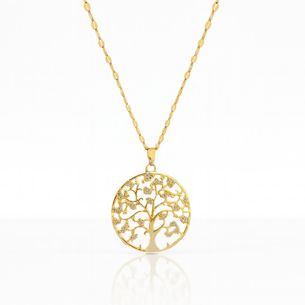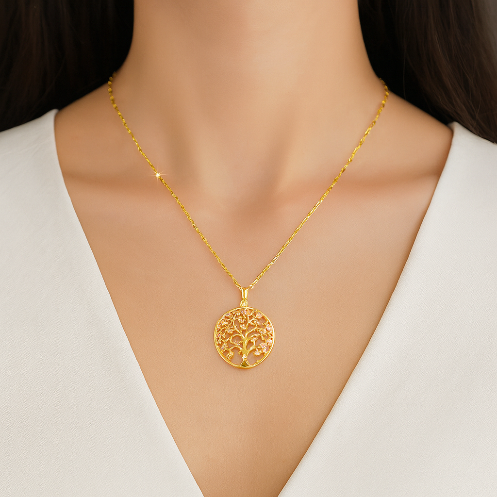 Zeitloses Design: Der elegante Baum-des-Lebens-Anhänger verleiht jedem Outfit eine bedeutungsvolle Note.