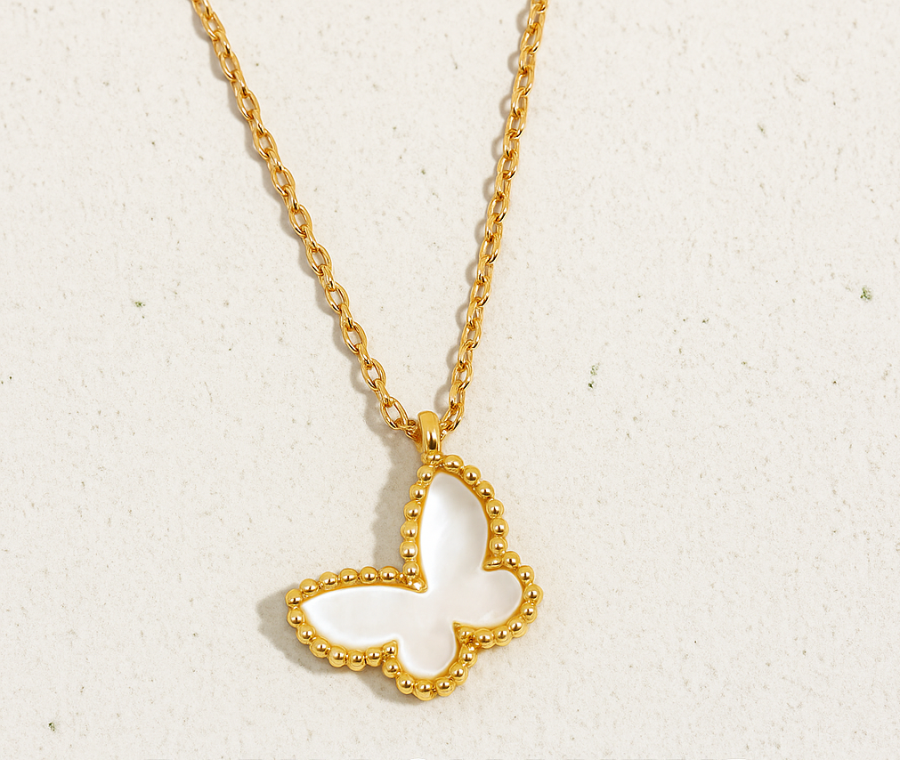 Zart, strahlend und zeitlos – die Papillon Lueur Halskette ist ein Symbol für Leichtigkeit und Eleganz. Der fein gearbeitete Schmetterlingsanhänger aus natürlichem Perlmutt spiegelt das Licht auf besonders sanfte Weise wider und macht jedes Stück zu einem Unikat.